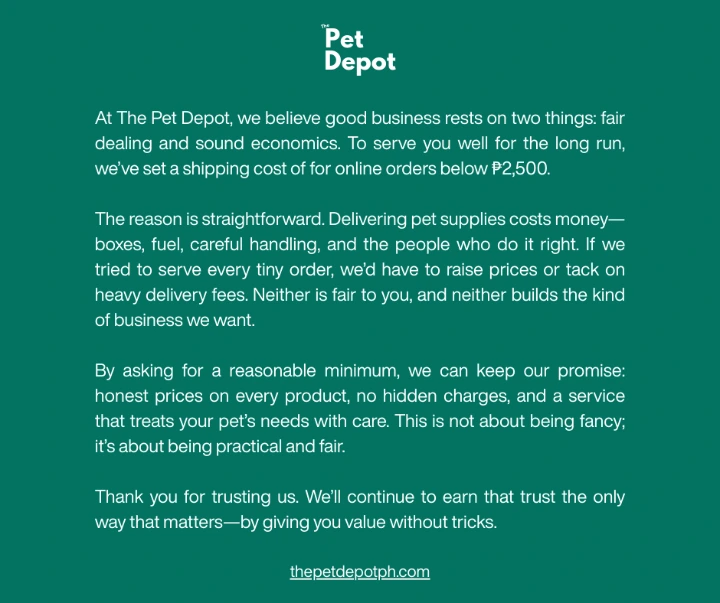 That said, as we are just beginning, we will work our way toward offering pet supplies at the best prices you can find in the marketplace. This means The Pet Depot seriously looks for high-quality pet supplies that it can proudly sell in its stores. But this process may take time and — similar to our reader who has reached this part of our letter — requires patience and understanding. Our approach to retailing is to operate for a long time, and we want to earn your trust starting today. And so, we have decided to keep our marketing activities to a minimum in order to uphold our goal of having the best price in the market.
